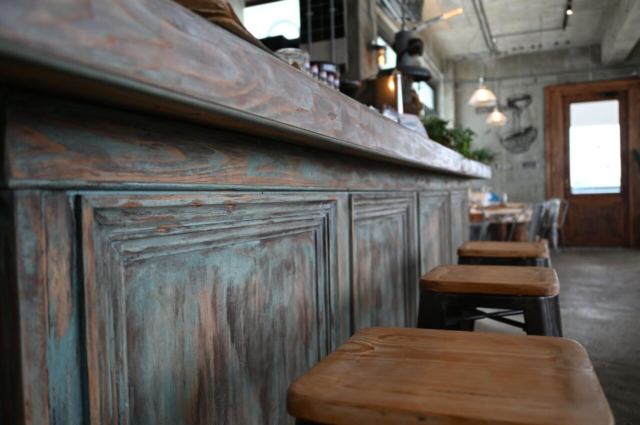 ミントグリーンの壁が印象的な白い階段を上がると、店内は、海を望む大きな窓が広がる、おしゃれで温かみのある開放的な空間。