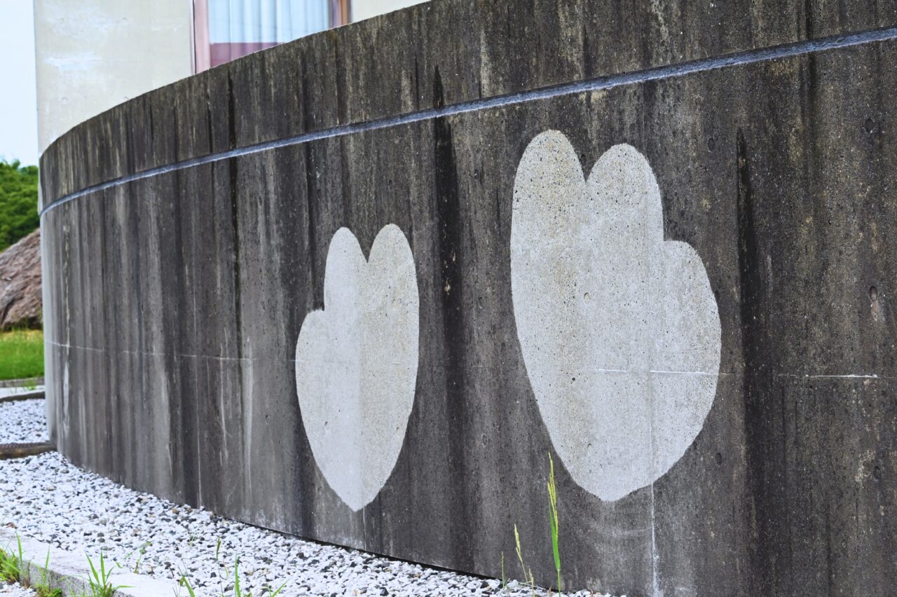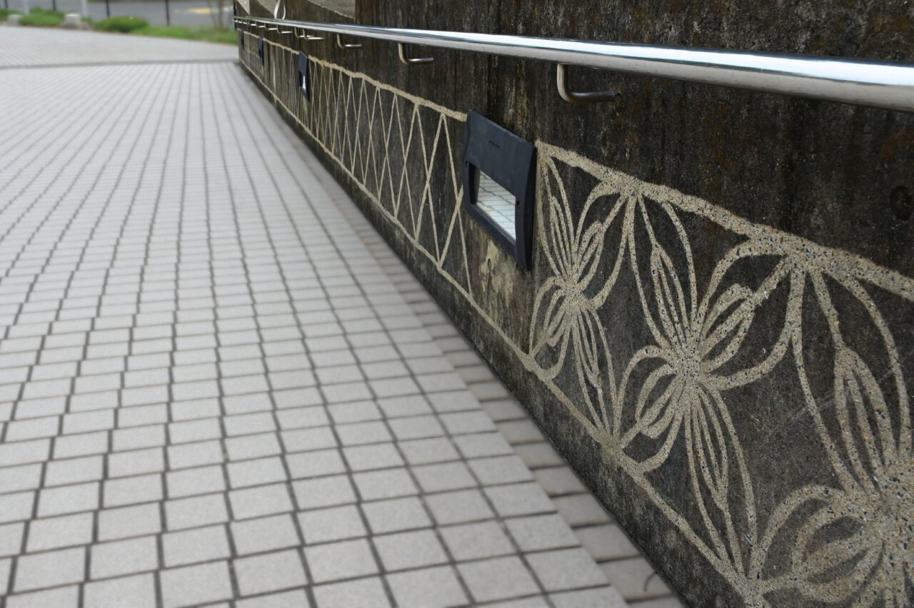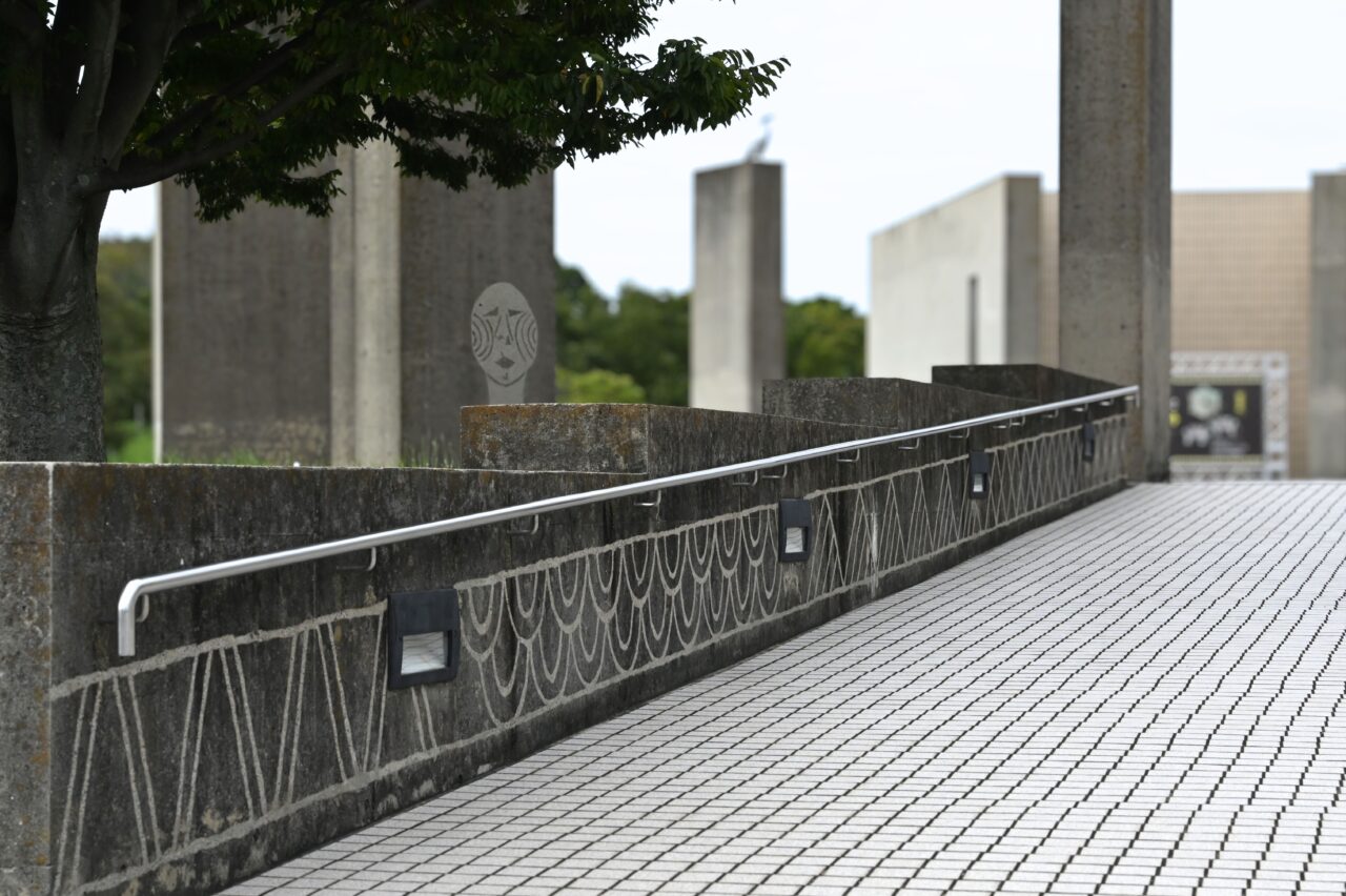 縄文式土器の文様、土偶、印章など、コンクリートの壁に浮かび上がるモチーフは、どれも柔らかなタッチで刻まれています。
