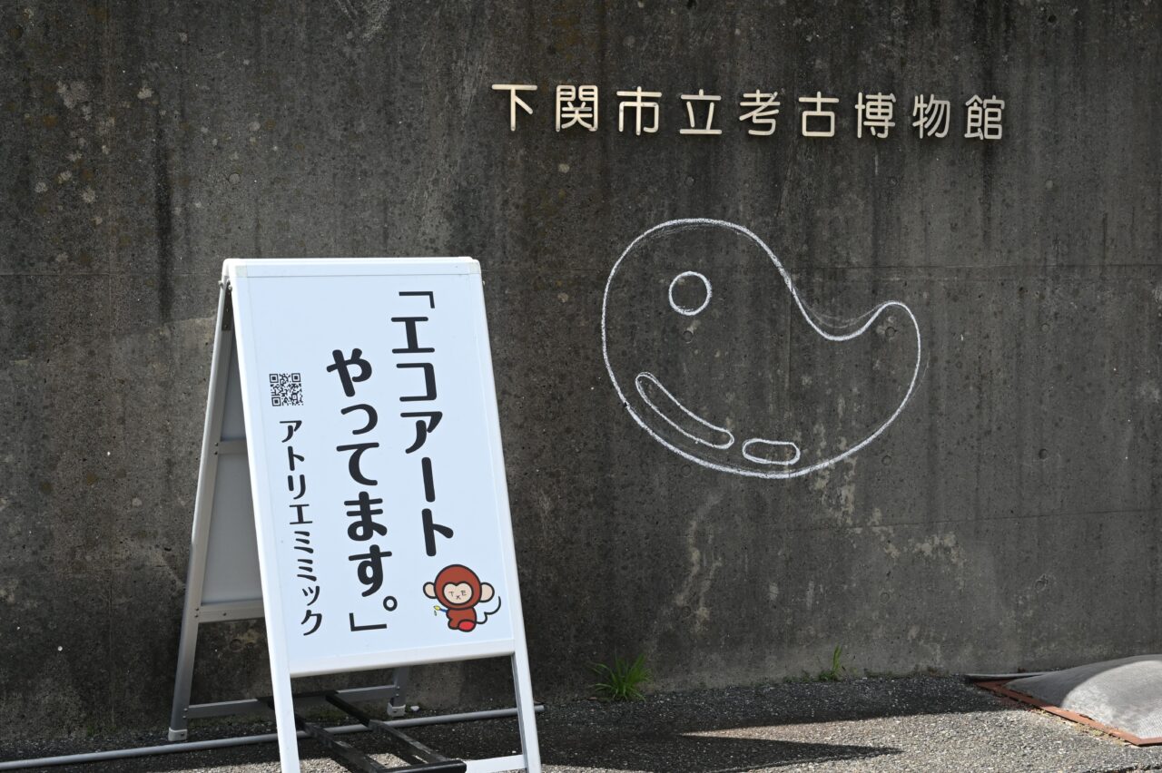 今回は下関市立考古博物館に姿を現し、ゲートからスロープの壁へ、そして、外壁へと、建物を包み込むように連なる物語が描かれています。