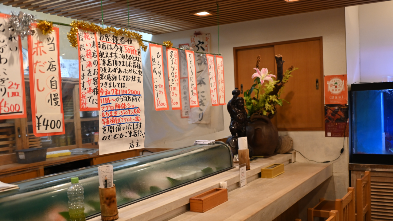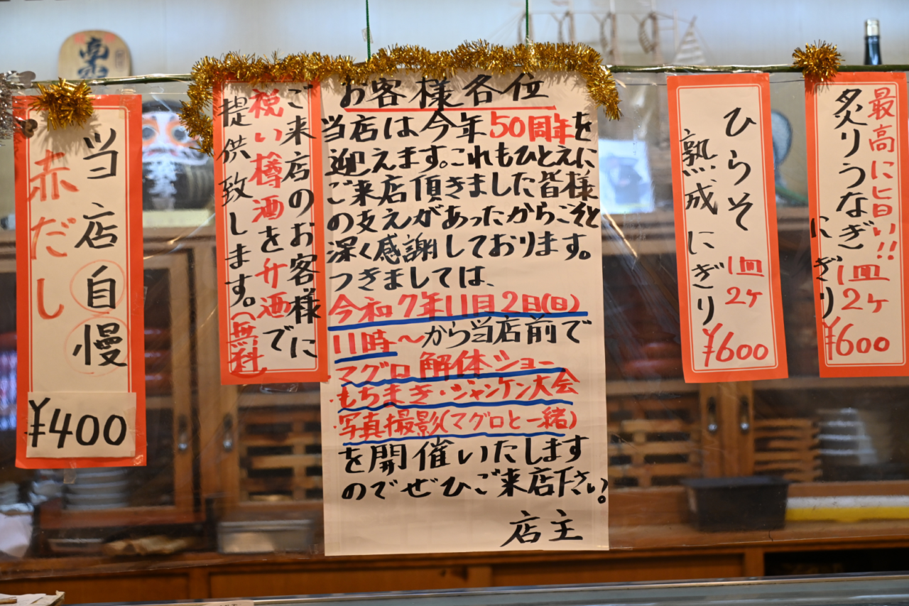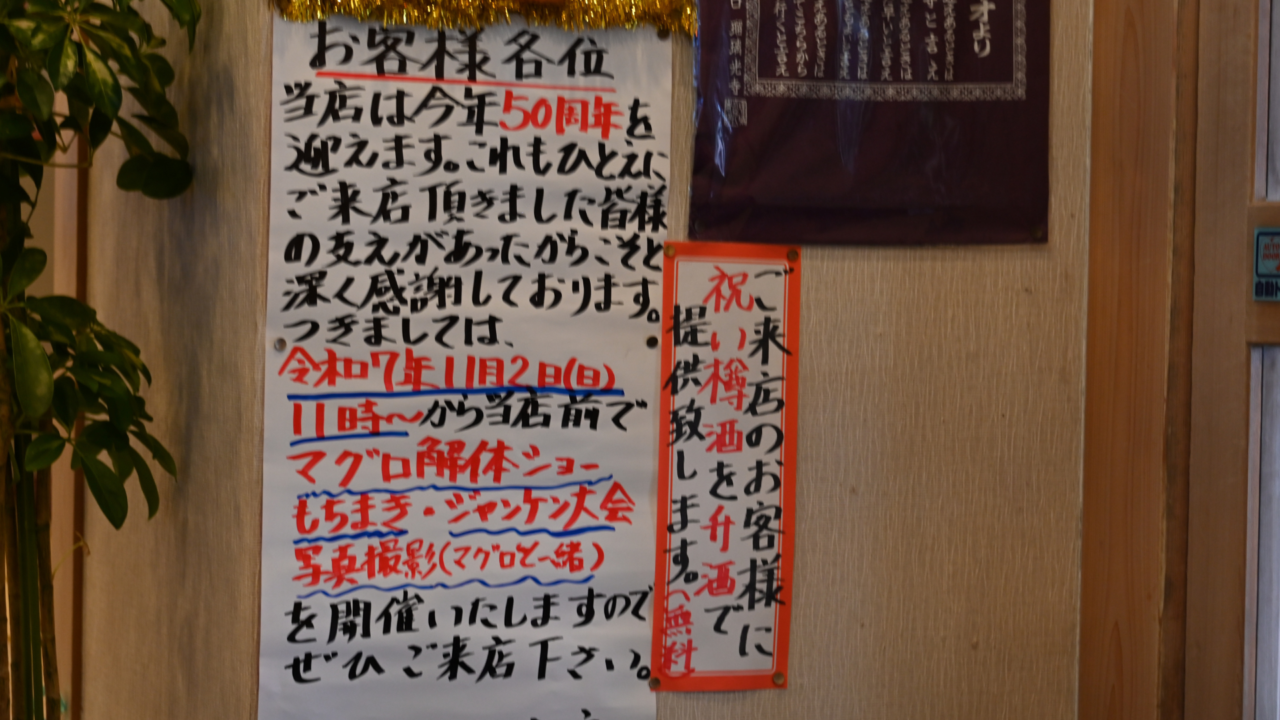 2025年11月2日(日)50周年記念イベントで、マグロの解体ショーと、3貫¥500のマグロの握りが提供される、㈲浜寿司さんはこちら↓