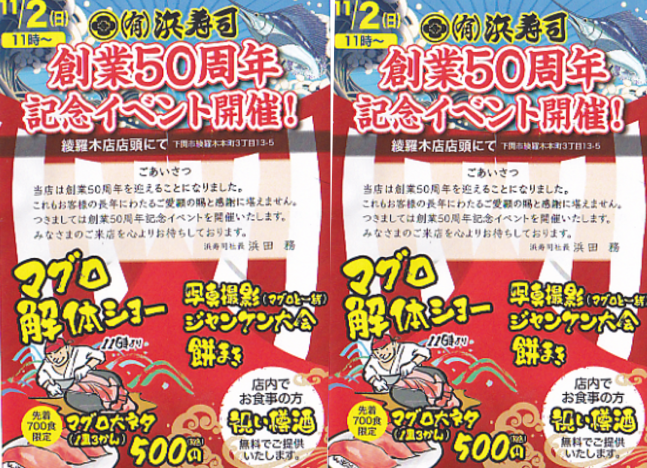 創業50周年を迎える(有)浜寿司さんで、2025年11月2日(日)11:00から記念イベントが開催されるそうです。