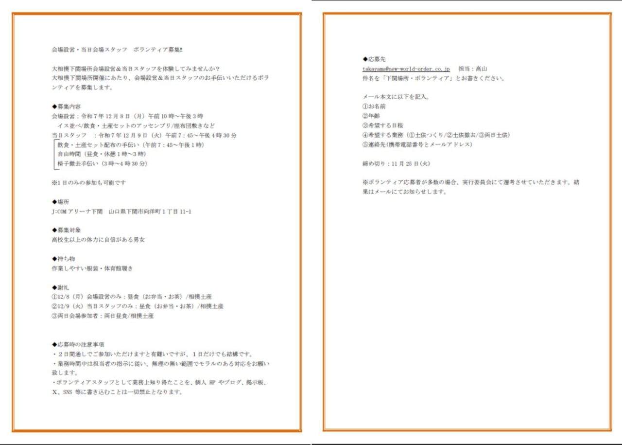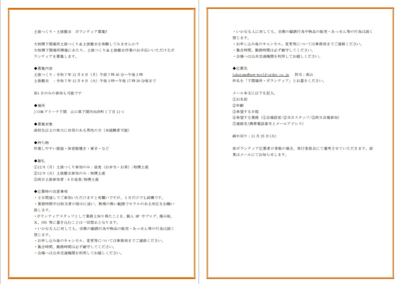 下関場所では、当日のスタッフや、土俵づくりと撤去を手伝うボランティアを募集中です。