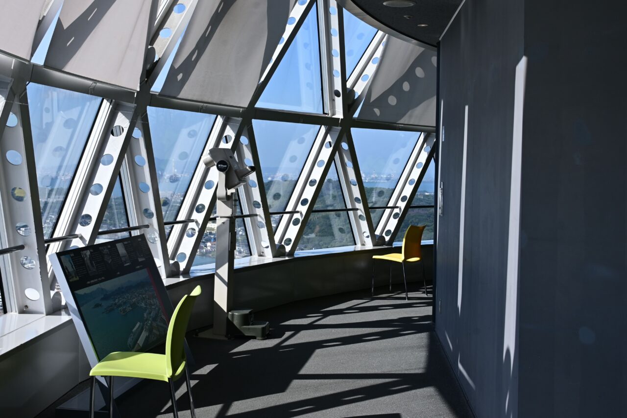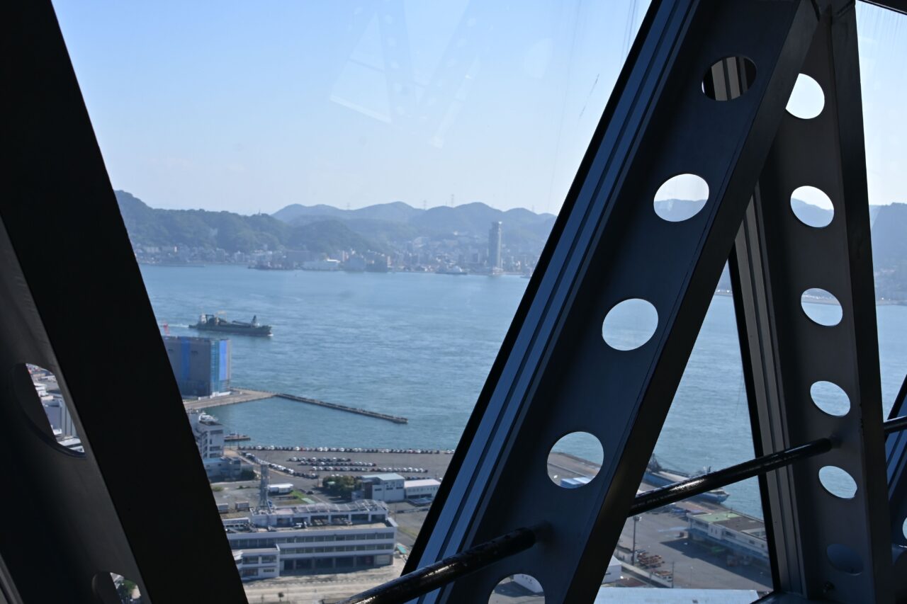普段は、立ち入ることが許されない非常階段を登りきった先のゴールは最上階、360度、関門海峡を見下ろすことのできる展望室。