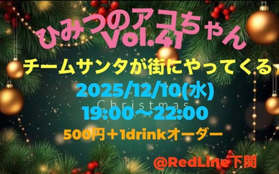 2025年12月10日(水)19:00〜22:00、「ひみつのアコちゃん VOL.41 〜チームサンタが町にやってくる〜」が開催される豊前田のライブハウスREDLINE下関さんはこちら↓