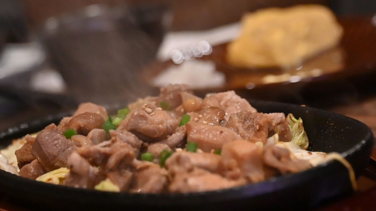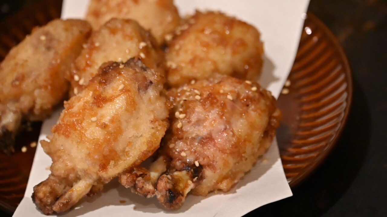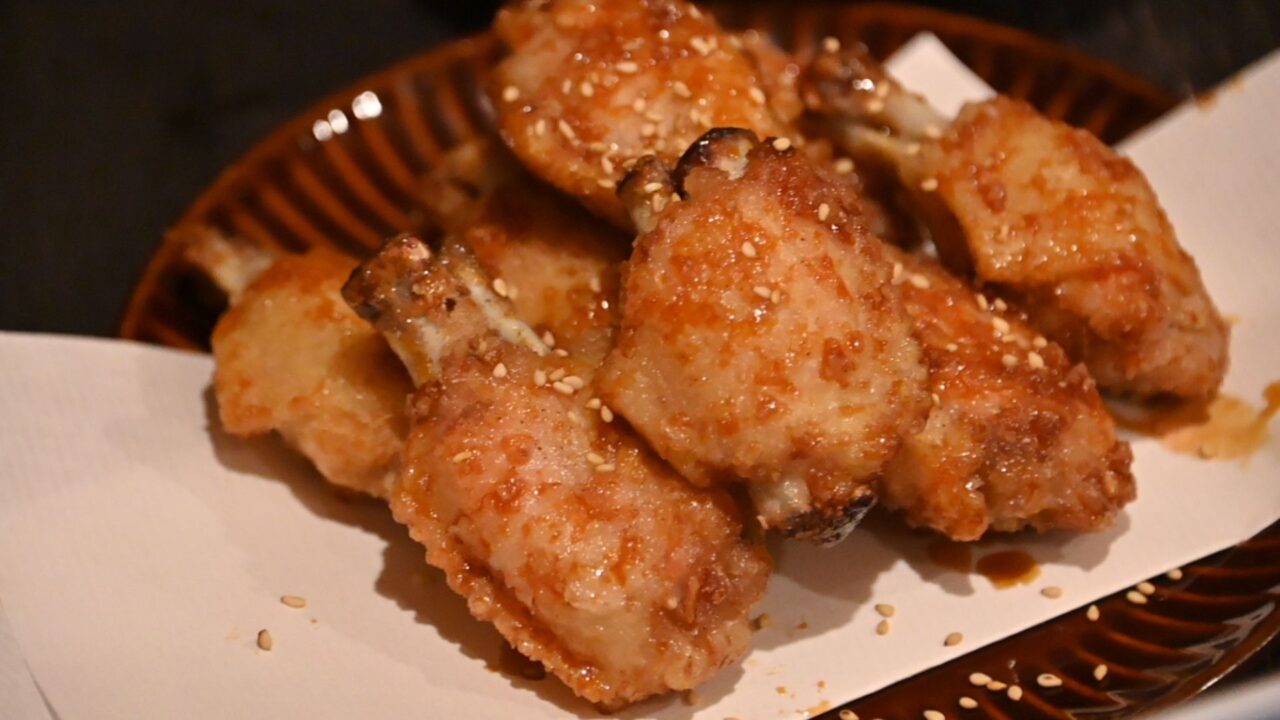 また、脇を固めるもう一つの人気メニューが、揚げ物No.1の手羽先の甘辛唐揚げとのこと。まるまるとした手羽先が脂をパチパチとはじかせながら登場します。