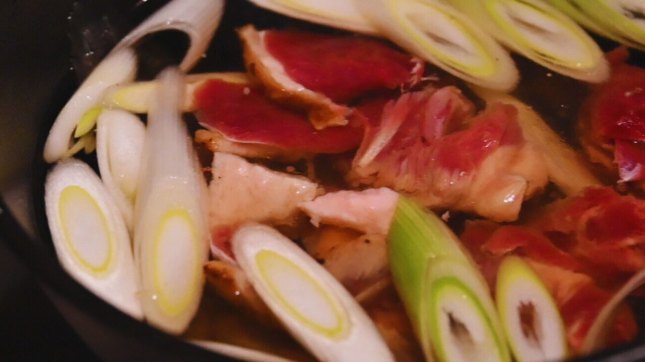 1・鍋がぐつぐつ沸いてきたら、出汁をまとったネギを、合鴨に絡めて、地元の合鴨の濃厚な旨みを堪能。2・途中で白菜を投入し、合鴨の旨みと野菜の甘みが溶け込んだ出汁を心ゆくまで味わう。