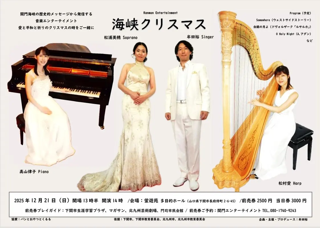 2025年12月21日(日)、長府侍町の「蛍遊苑 多目的ホール」にて、歴史とクラシック音楽が交差するコンサート「海峡クリスマス 2025」が開催されます。