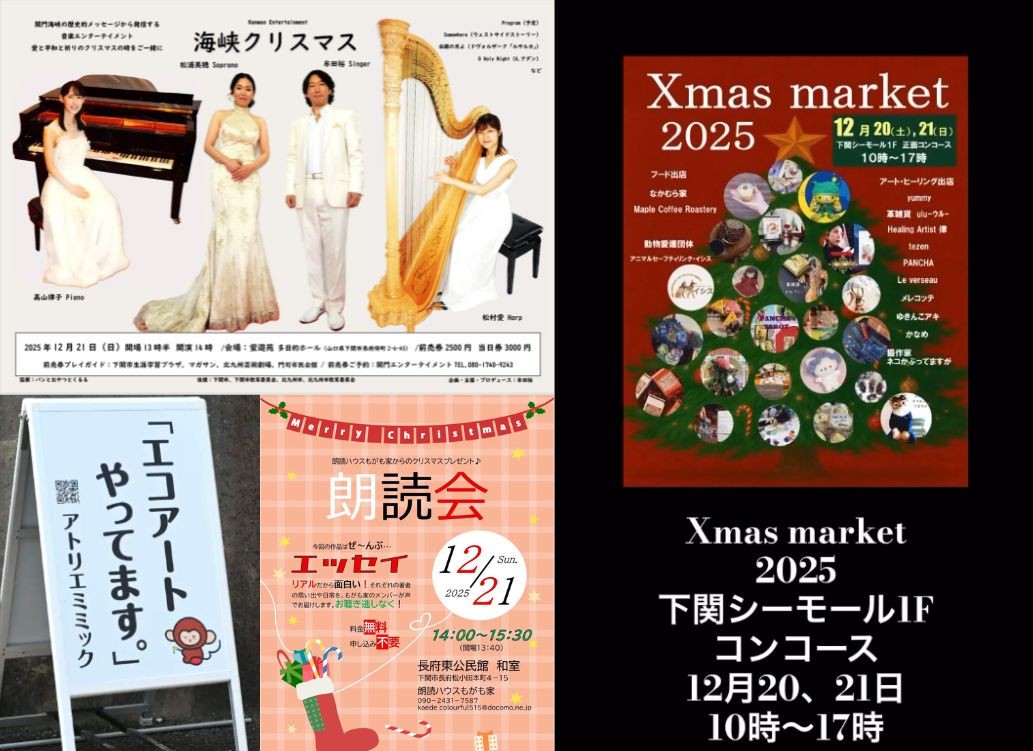 クリスマス目前の週末!2025年12月21日(日)に、号外ネット下関にて、紹介させて頂きましたイベントをピックアップしました。自分へのご褒美を探しに行ったり、芸術に浸ったり。素敵な日曜日のプランにお役立てください。