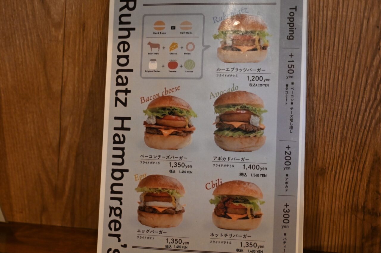 メニューは、¥1,200のルーエプラッツバーガーをベースに、¥150でベーコンやチーズを追加したり、¥200でアボカドを追加したり、さらに¥300でパティを追加できるシステムです。