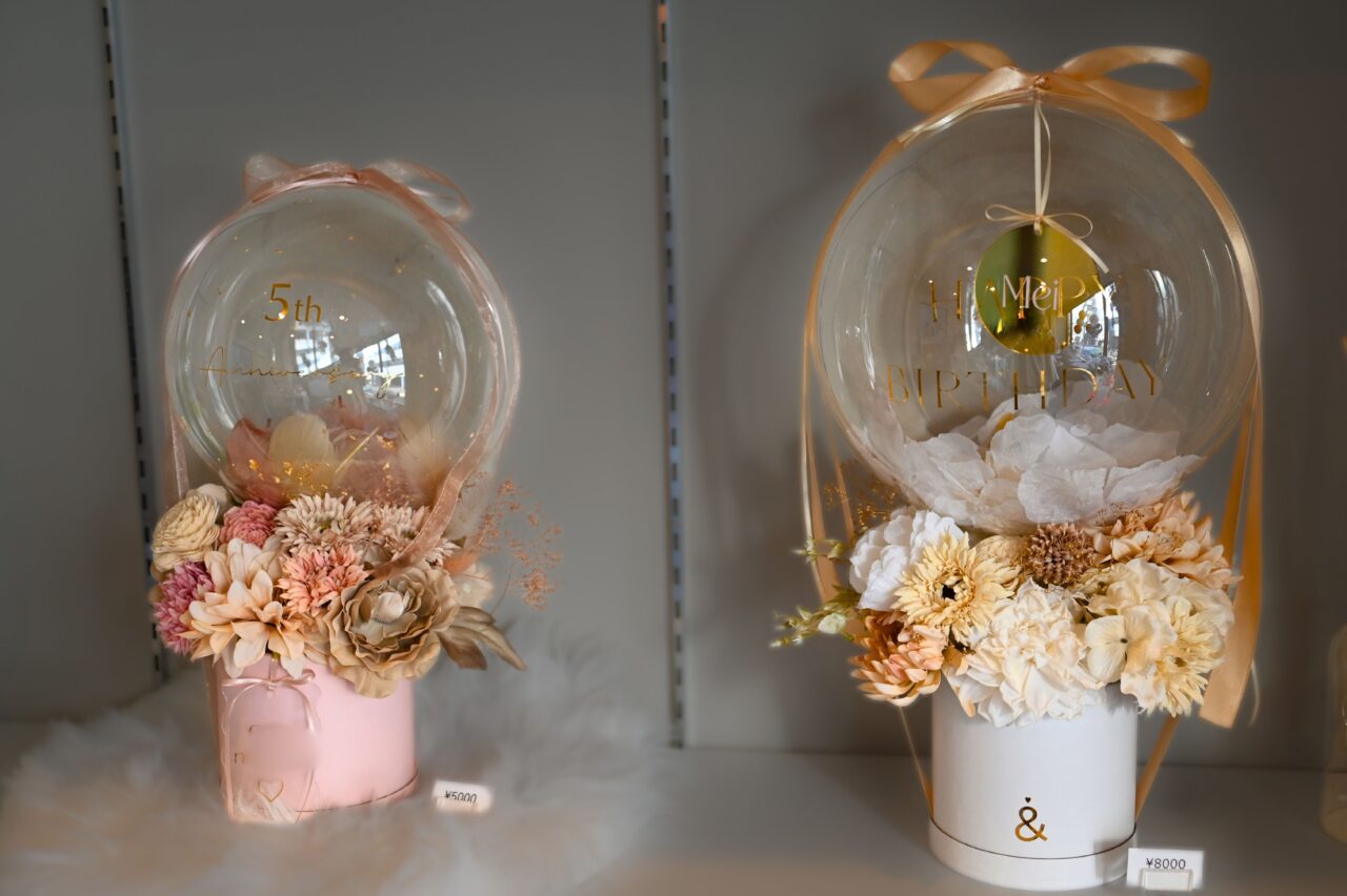 店内には、卒業式や成人式、誕生日や開店祝いを華やかに彩るバルーンのサンプルが並びます。