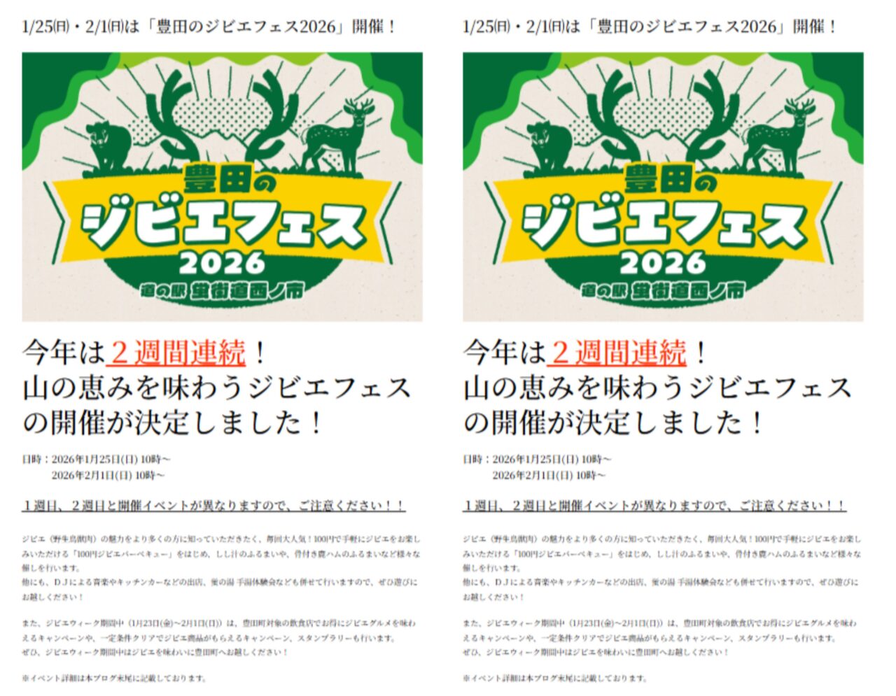 2026年、今年の『ジビエフェスin蛍街道西ノ市』は、1月25日と2月1日の2週連続開催。例年以上の熱気を帯びて、開催されます。