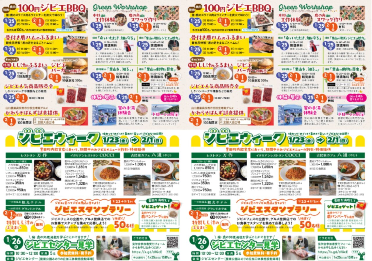 - ●100円ジビエバーベキュー・①10:00~ ②13:00~ ・1人1皿限定 1皿100円・各回先着100名(計200名) ・各回30分前より整理券配布