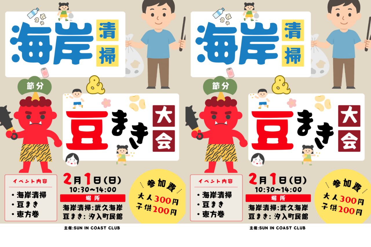 来月の清掃は、2026年2月1日の(日)。10:30~、海岸清掃と、正午からは節分の豆まきと恵方巻作りが予定されています。