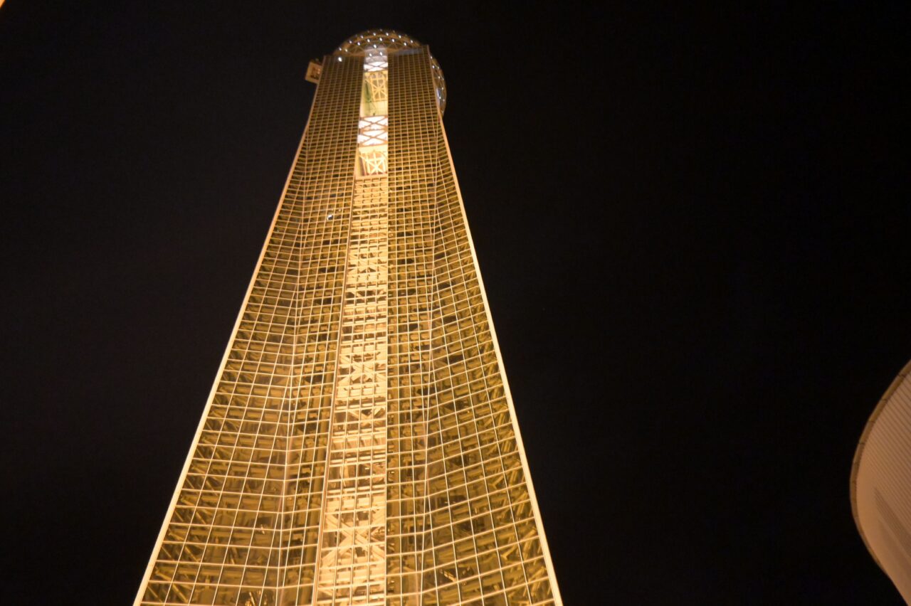 2025年のミモザプロジェクトで、ミモザ色にライトアップされた海峡ゆめタワー。