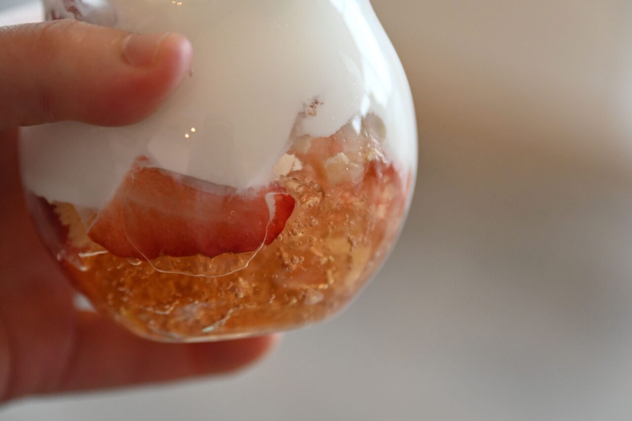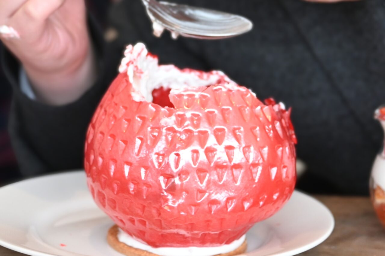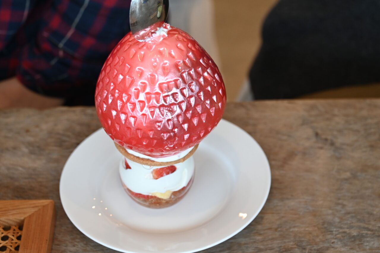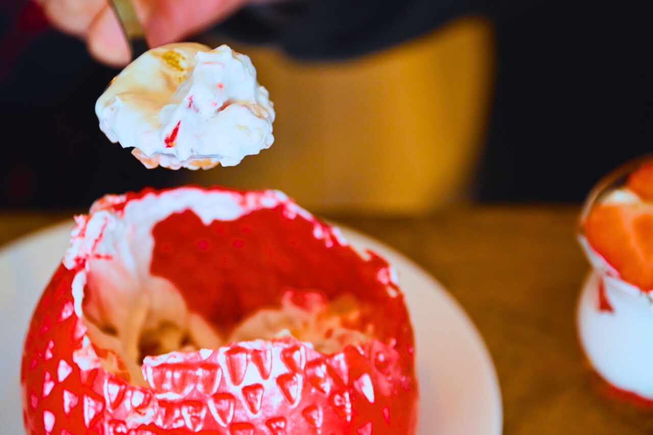 その飴のドームの中は、一つ目のパフェ。真っ白な生クリームと、フレッシュないちごが、これでもかというほど詰め込まれています。