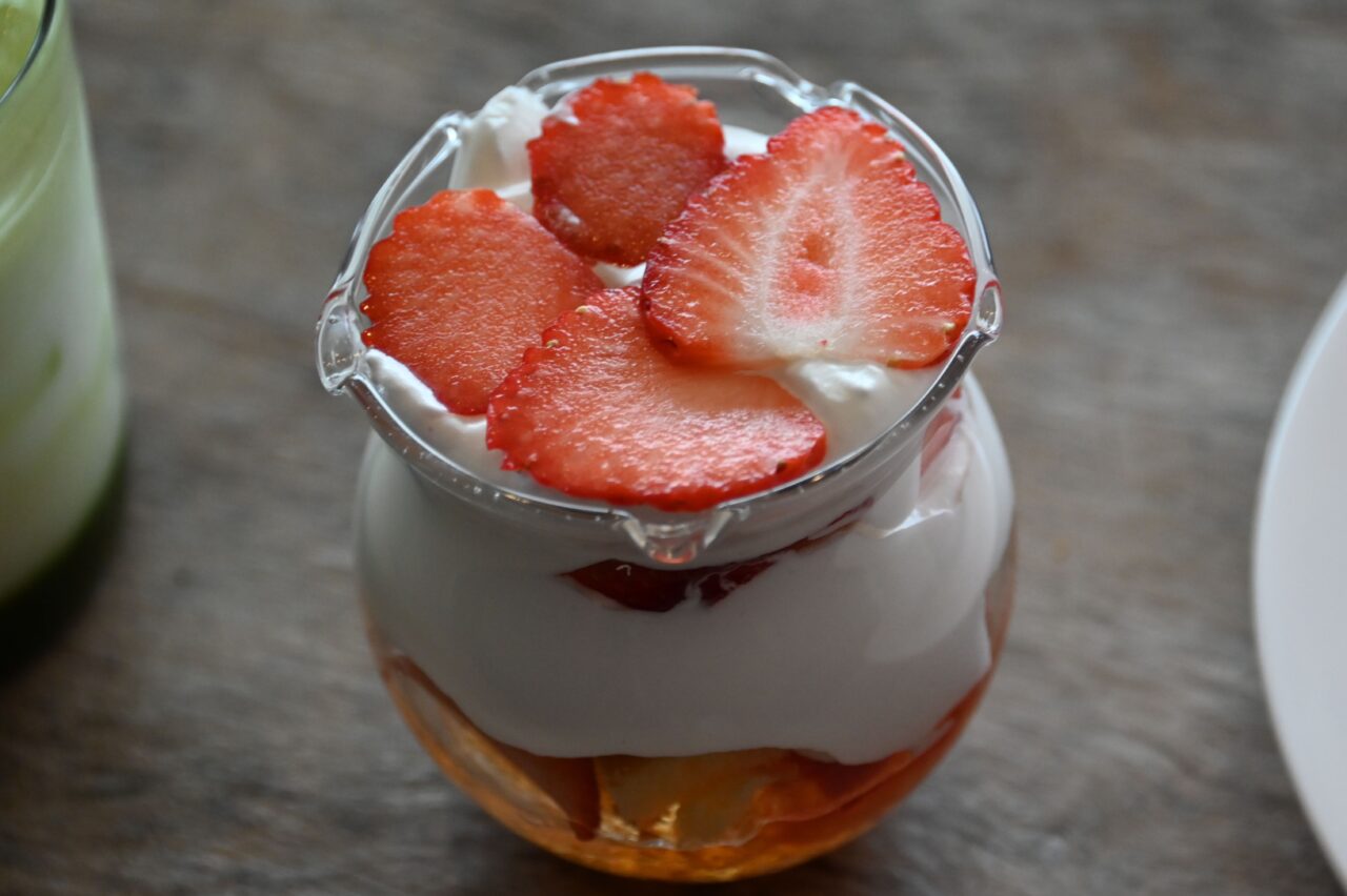 下のグラスにもたっぷりの生クリームといちご、そしてグラスのパフェの最後には琥珀色の紅茶ゼリーが忍ばせてあります。