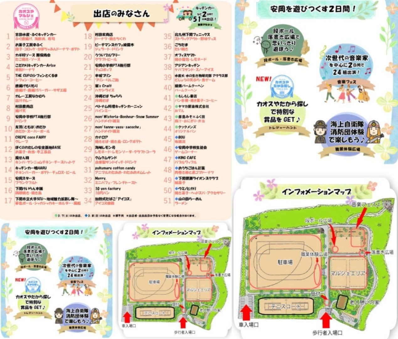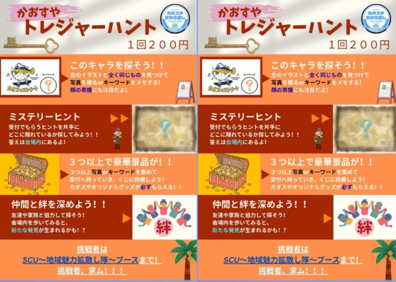 その他にも、学生企画の「トレジャーハント」や段ボール広場、さらには安岡消防団や海上自衛隊による職業体験まで、子どもたちの好奇心を刺激する仕掛けも満載です。