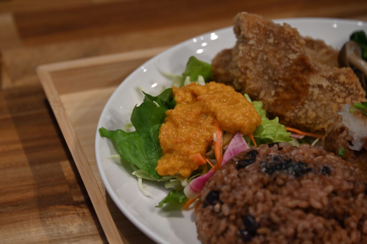 その主役を務めるのは、サクッと軽い黄金色の衣に包まれた車麩のフライ。カリカリの衣から、たっぷりのお出汁がじゅわっとあふれ出します。お肉のような満足感なのに、驚くほどヘルシーな後味。