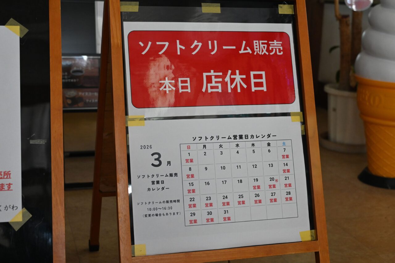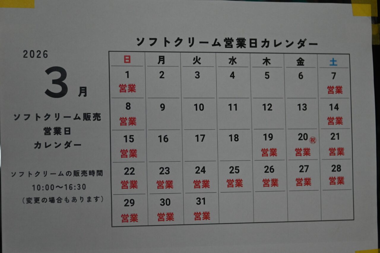 この時期のソフトクリーム販売は、少しだけ変則的なスケジュールになっているようで、3月19日(木)からは毎日営業となる予定ですが、それまでは土日のみの限定販売とのこと。