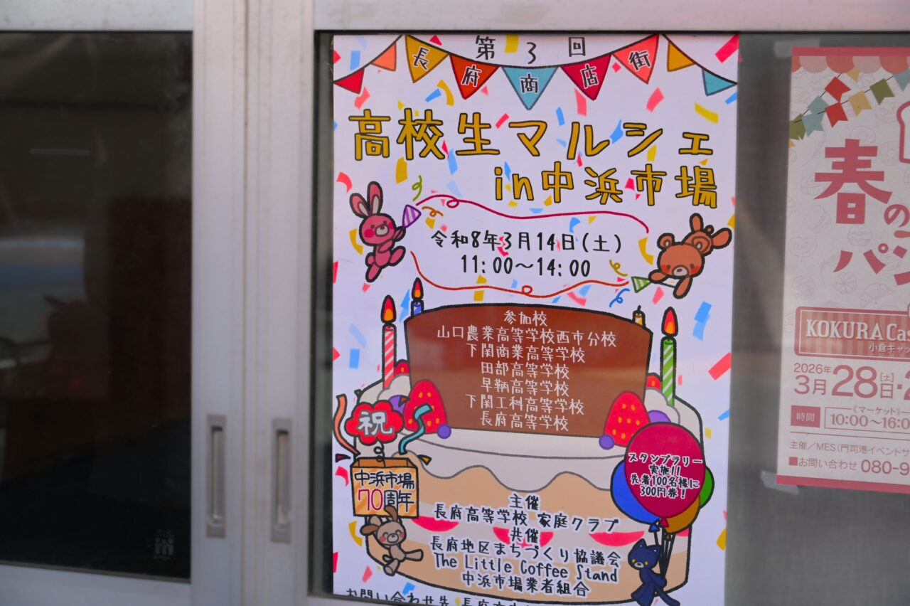 2026年3月14日(土)、11:00から14:00までの3時間、山口農業高等学校西市分校、下関工科高等学校、下関商業高等学校、田部高等学校、早鞆高等学校、そして長府高等学校の6校が参加した、「第3回 高校生マルシェ in 中浜市場」が開催されます。