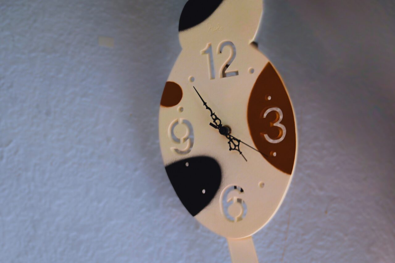 猫の箸置きに猫のコップごはんをよそって。猫の時計を見上げて、ため息ひとつ。
