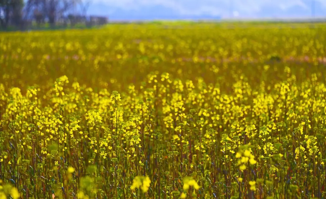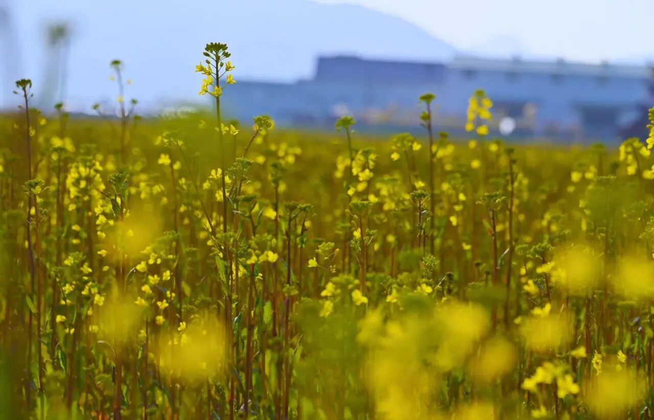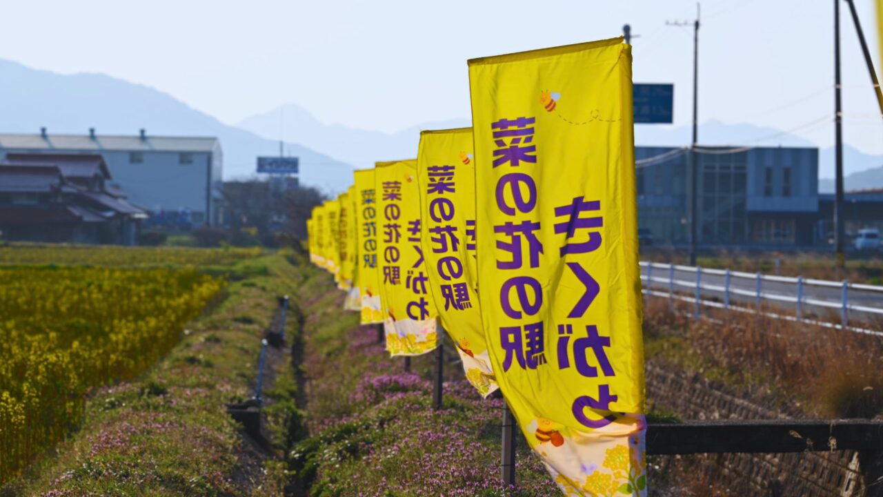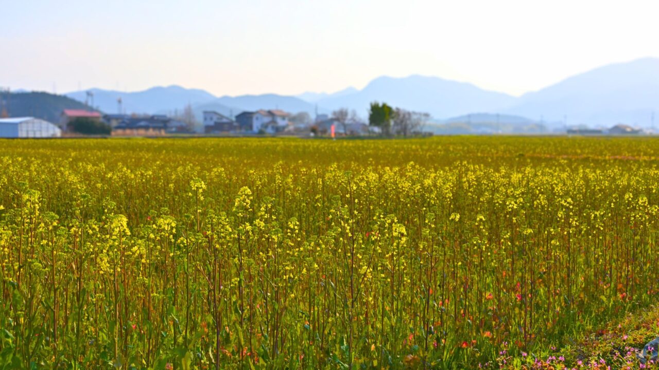 遠くの山の緑と青い空が視界から追い出されるように、黄色だけが広がっていく、圧倒されるほどの一面の菜の花が、訪れる人を迎えてくれそうです。