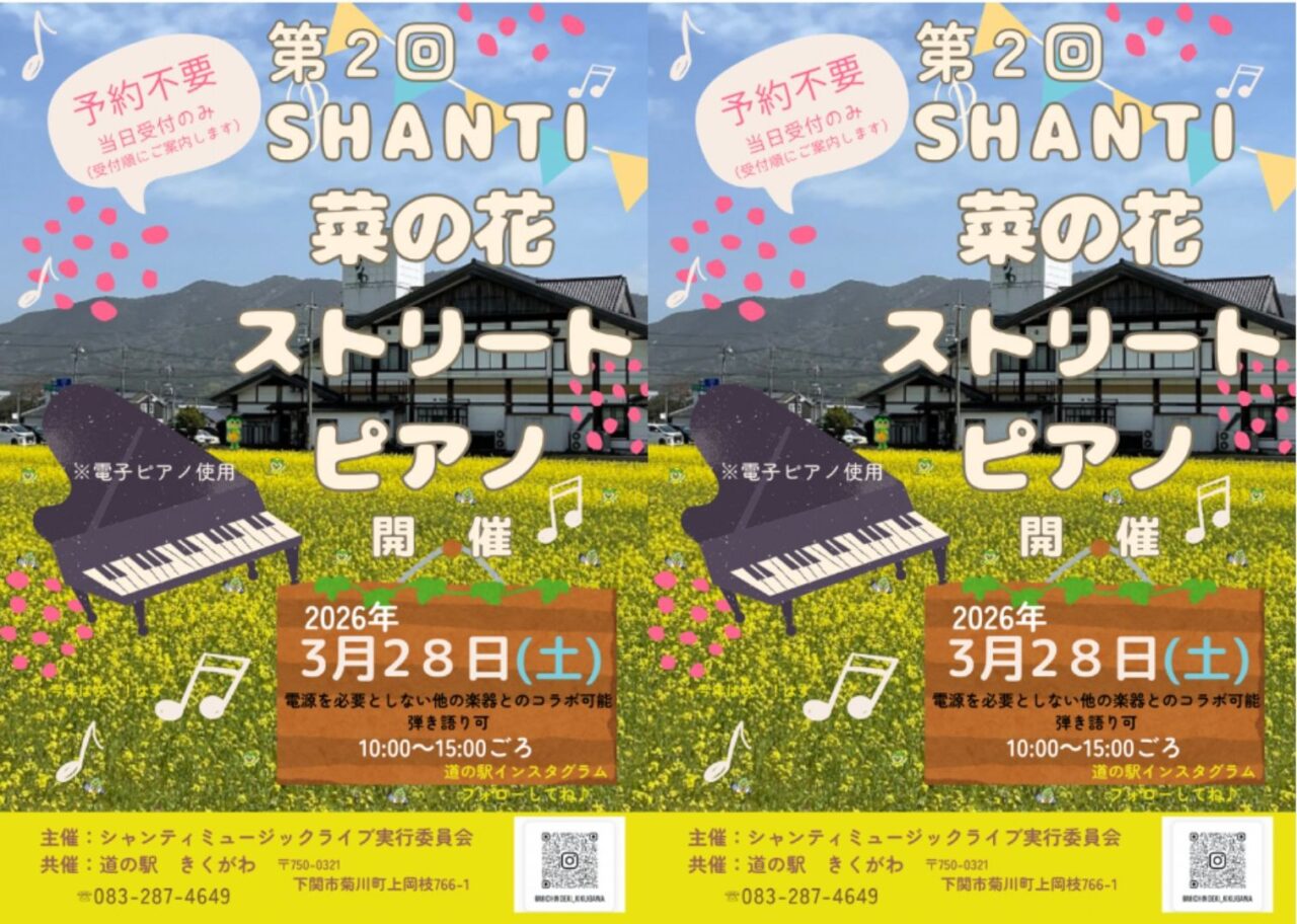 - 3月28日 (土) 道の駅きくがわ「菜の花ストリートピアノ」イベント 10:00~15:00