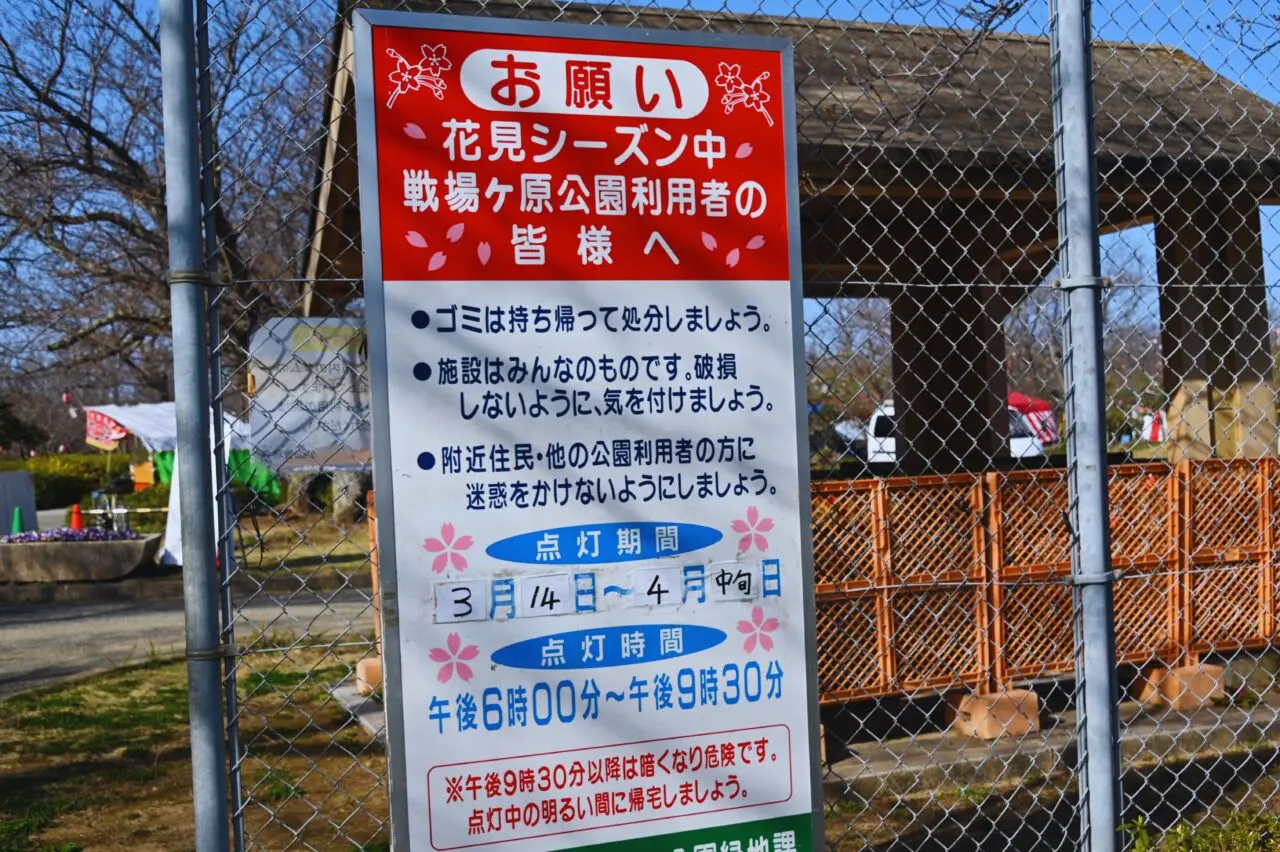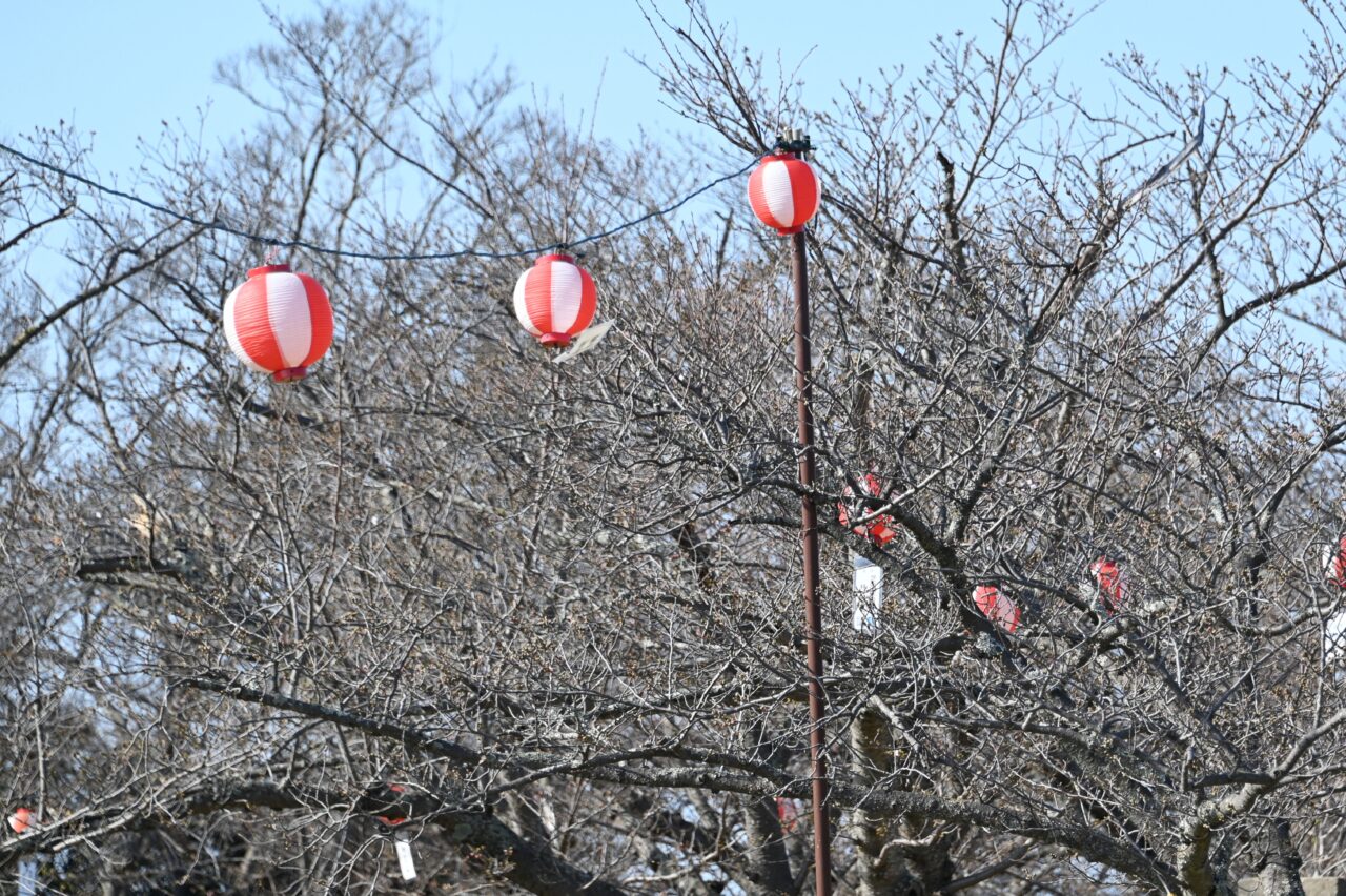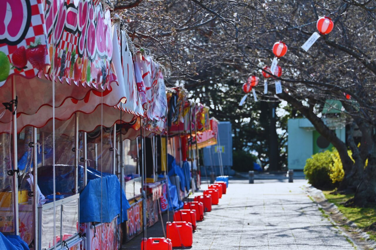 広場にはお花見の屋台がずらりと立ち並び、花見の準備はすっかり整った様子。