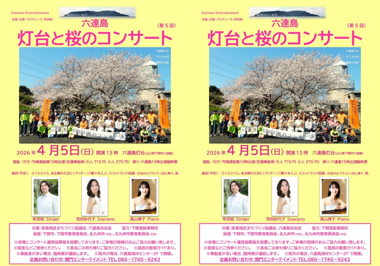明日、2026年4月5日(日)、下関港から連絡船で渡った先の小さな島、六連島で、第5回「灯台と桜のコンサート」が開かれます。