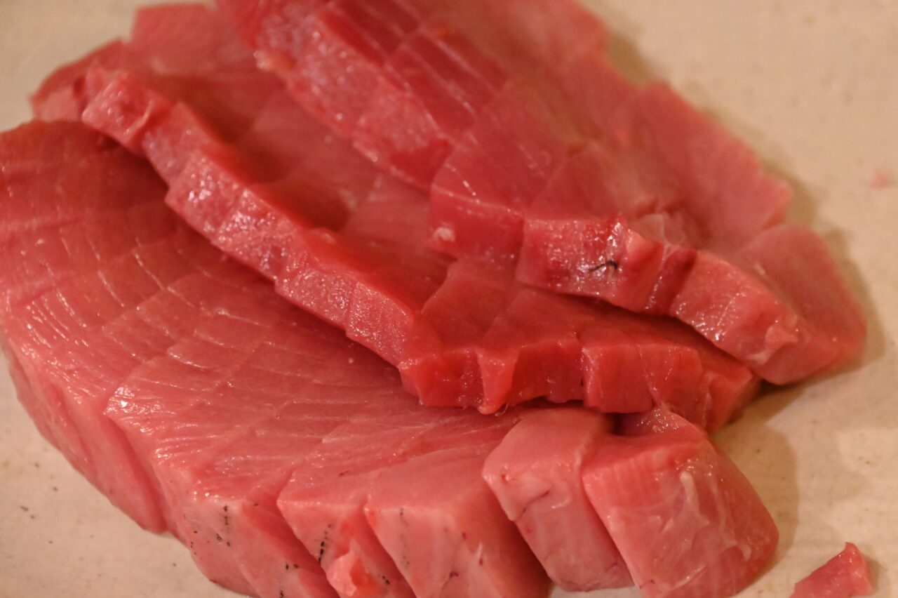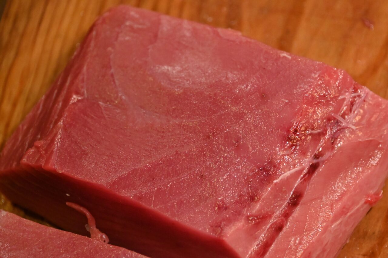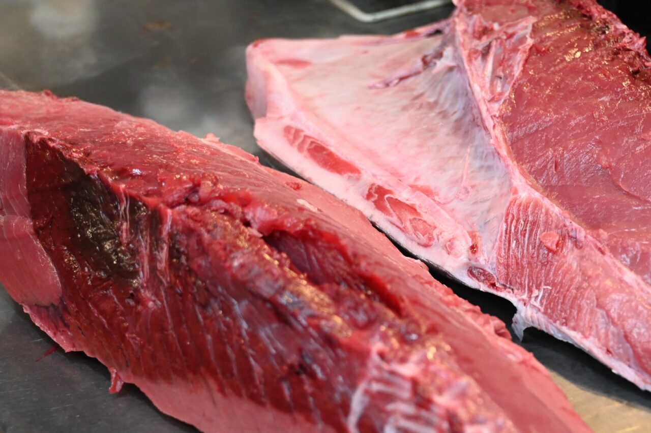 大きなマグロに包丁が入り、一太刀ごとに現れる艶やかな断面。