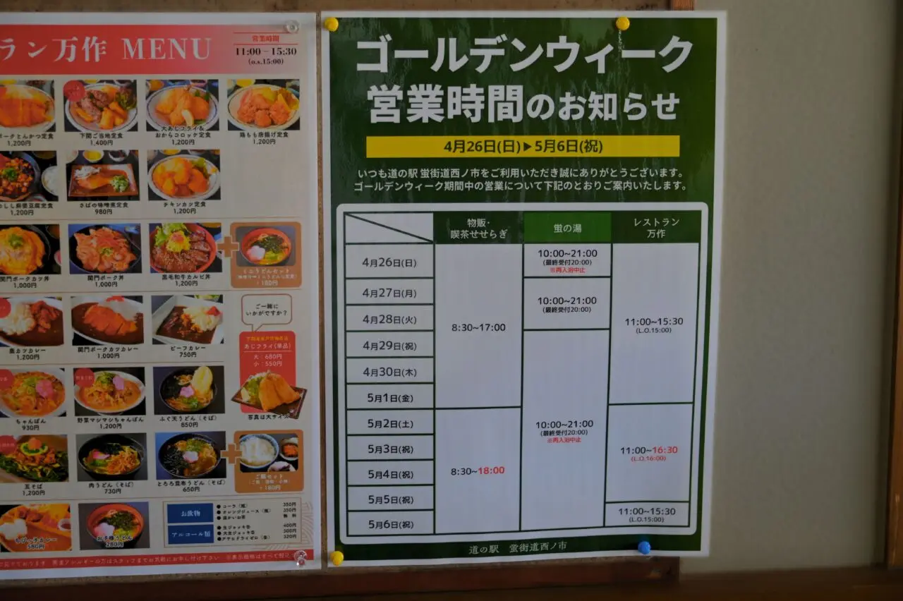 ゴールデンウィークのお出かけ先として人気の蛍街道西ノ市ですが、連休期間中は一部施設で営業時間が変更となっているようです。